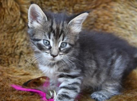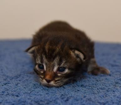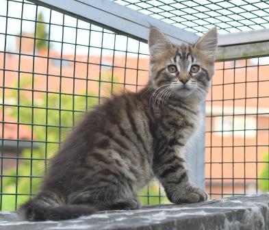 Kleur: Zwart tabby spotted (met wit) - NFO n 24. Maggie heeft minimaal wit onder haar kin, ze staat niet als '09' op de stamboom maar wel in pawpeds